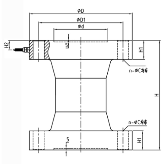 量程(kN) 量程(t) D D1 d H H1 H2 N-φC 300 30 mm 145 120 85 130 22 15 8-?16 500,600 50,60 mm 197 160 110 160 25 15 12-?22 1000 100 mm 240 200 135 230 42 28 12-?26 1500-2500 150-250 mm 305 250 160 326 57 45 12-?33 3000 300 mm 415 360 256 358 69 50 18-?33 | ||||||||||||||||||||||||||||||||||||||||||||||||||||||||||||