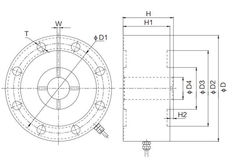 型號 | 量程(kN) | 量程(t) | D | D1 | D2 | D3 | D4 | H | H1 | H2 | W | T |