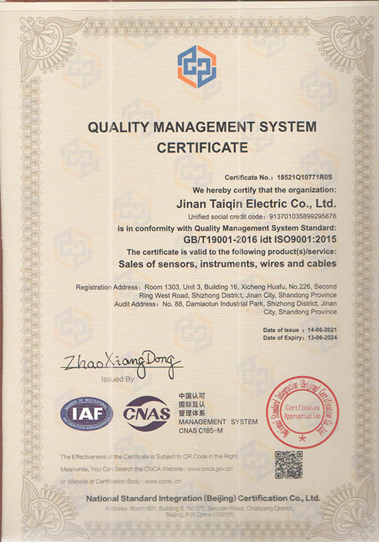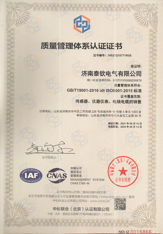 濟南泰欽傳感器,已通過ISO9001質量體系認證