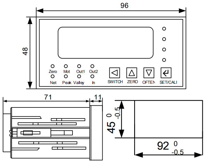 特點及用途: 1.可選用5位或6位數碼管顯示。 2.可以加RS232、RS485或者模擬量輸出三選一。 3.開關量可以選擇晶體管或者繼電器。 4.峰谷值測量,上下限報警。
